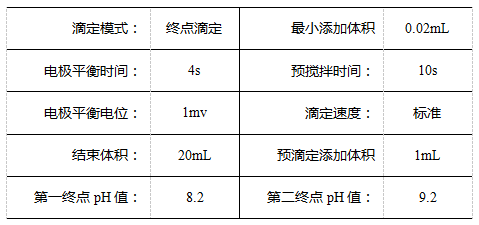 定容。混合均匀后取20mL稀释液,加水60mL,搅拌均匀后用氢氧化钠标准滴定溶液滴定至终点为8.2,后加入10mL甲醛溶液,搅拌均匀后,继续滴定至终点为9.2,同时做空白试验。