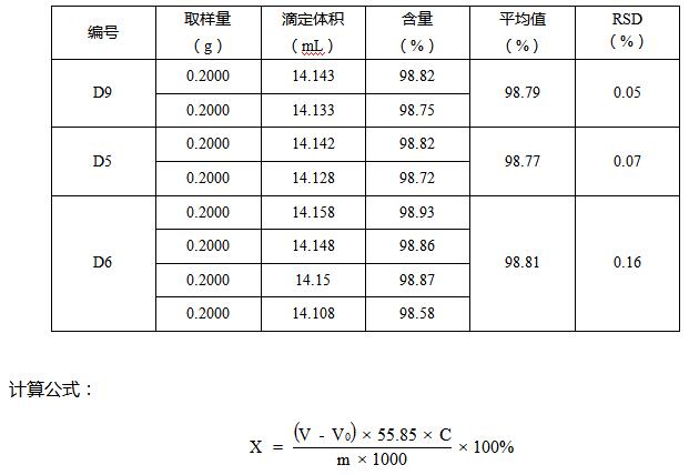 本文采用电位滴定的方式改进了铁粉中全铁含量的测定方法,为全铁测定提供了一定的参考依据。实验数据证明T960电位滴定仪测定结果精确度较高,稳定性良好,小于仪器的误差参数(0.2%),能够满足分析工作的需要。